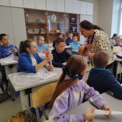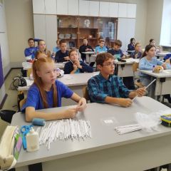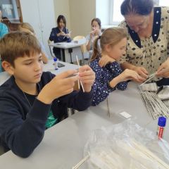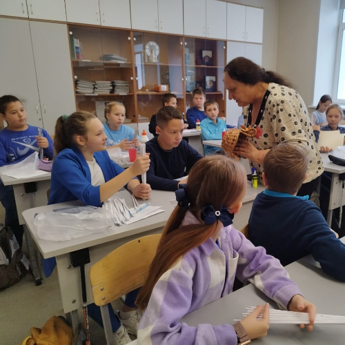 Людмила Филипповна Черемных, староста досугового клуба для пенсионеров «Зеркало», провела мастер-класс для учеников 5б класса школы № 8 г.Горно-Алтайска. Ребята учились плести изделия из бумажной лозы.