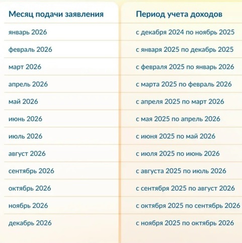 Это 12 месяцев, которые предшествовали одному месяцу до месяца обращения. При подаче заявления в декабре 2025 года оценка нуждаемости проводится с учетом доходов с ноября 2024 по октябрь 2025.