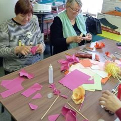 Ведущая данного мероприятия Наталья Прокопьевна Дубень познакомила участников с техниками создания цветов из различных материалов. Женщины вырезали, клеили, подбирали цвета и формы для цветов из бумаги.