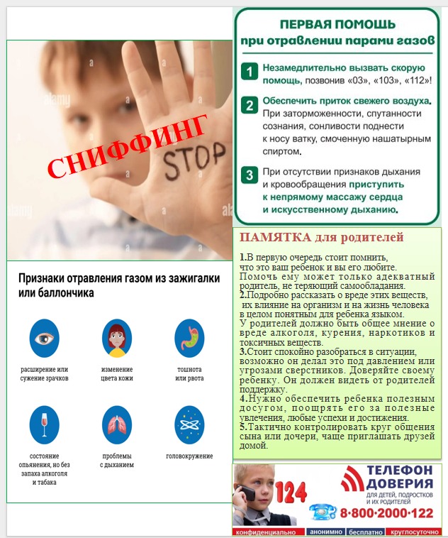 СНИФФИНГ – намеренное вдыхание паров химических соединений газов (бутан, изобутан и пропан), используемых в бытовых приборах (газовых зажигалках, туристических баллонах, освежителях воздуха и т.д.), вызывающие зависимость.
